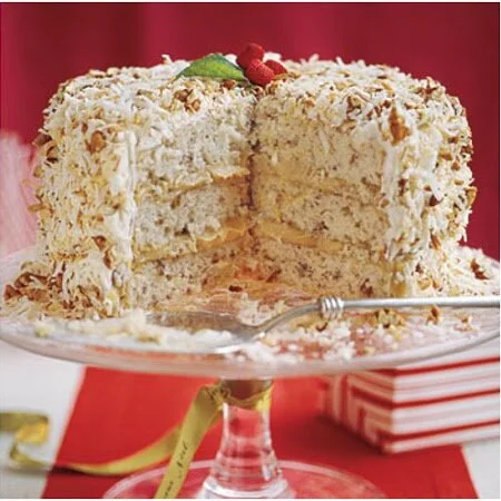 1. Stir 1 cup finely chopped coconut into Pecan Pie Cake Batter; spoon batter into 3 greased and floured 9-inch cake pans.